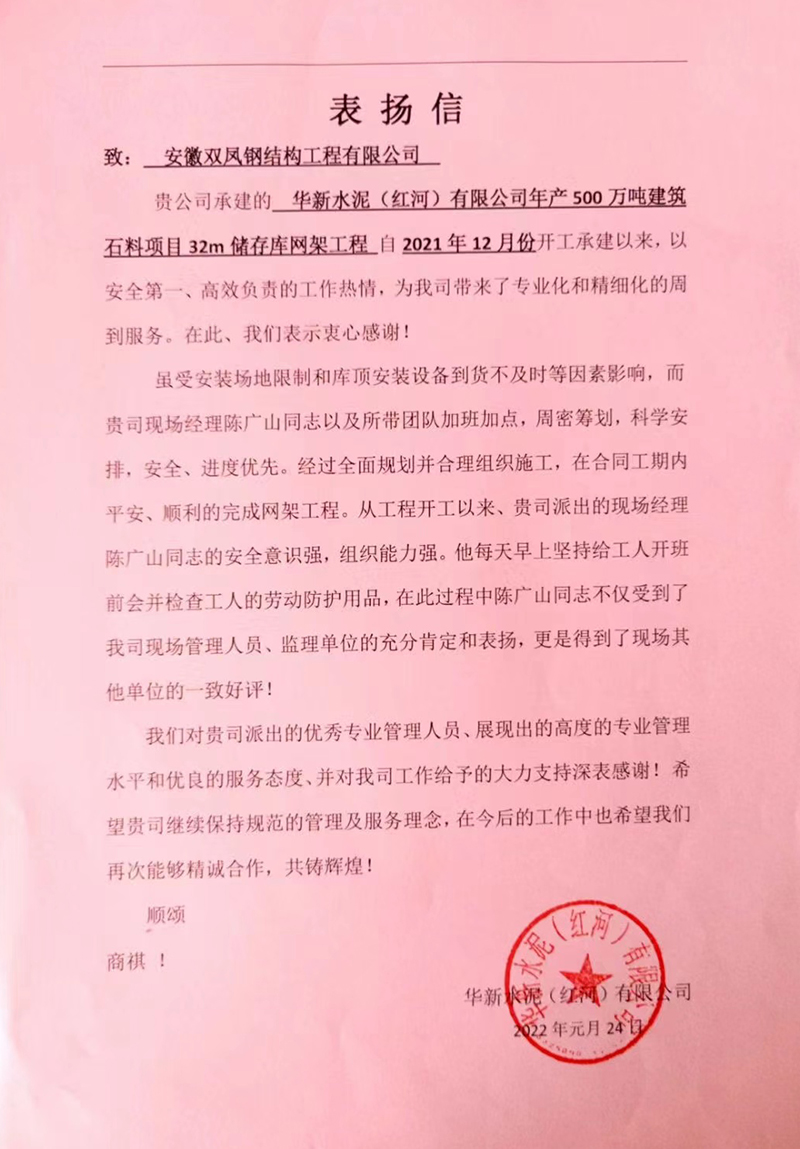 阜南(nán)齊耀電(diàn)廠表揚信