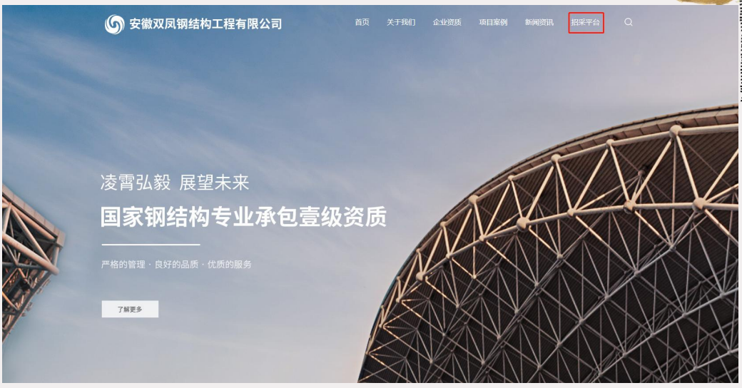 /    (安徽安廣鋼結構工程有限公司官網),進入首頁後點擊頁面上(shàng)右上(shàng)方"招采平台"按鈕進入。(詳見(jiàn)下(xià)圖)