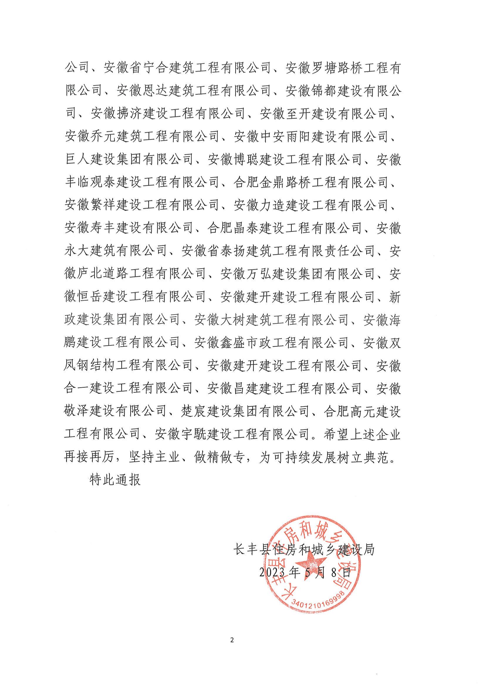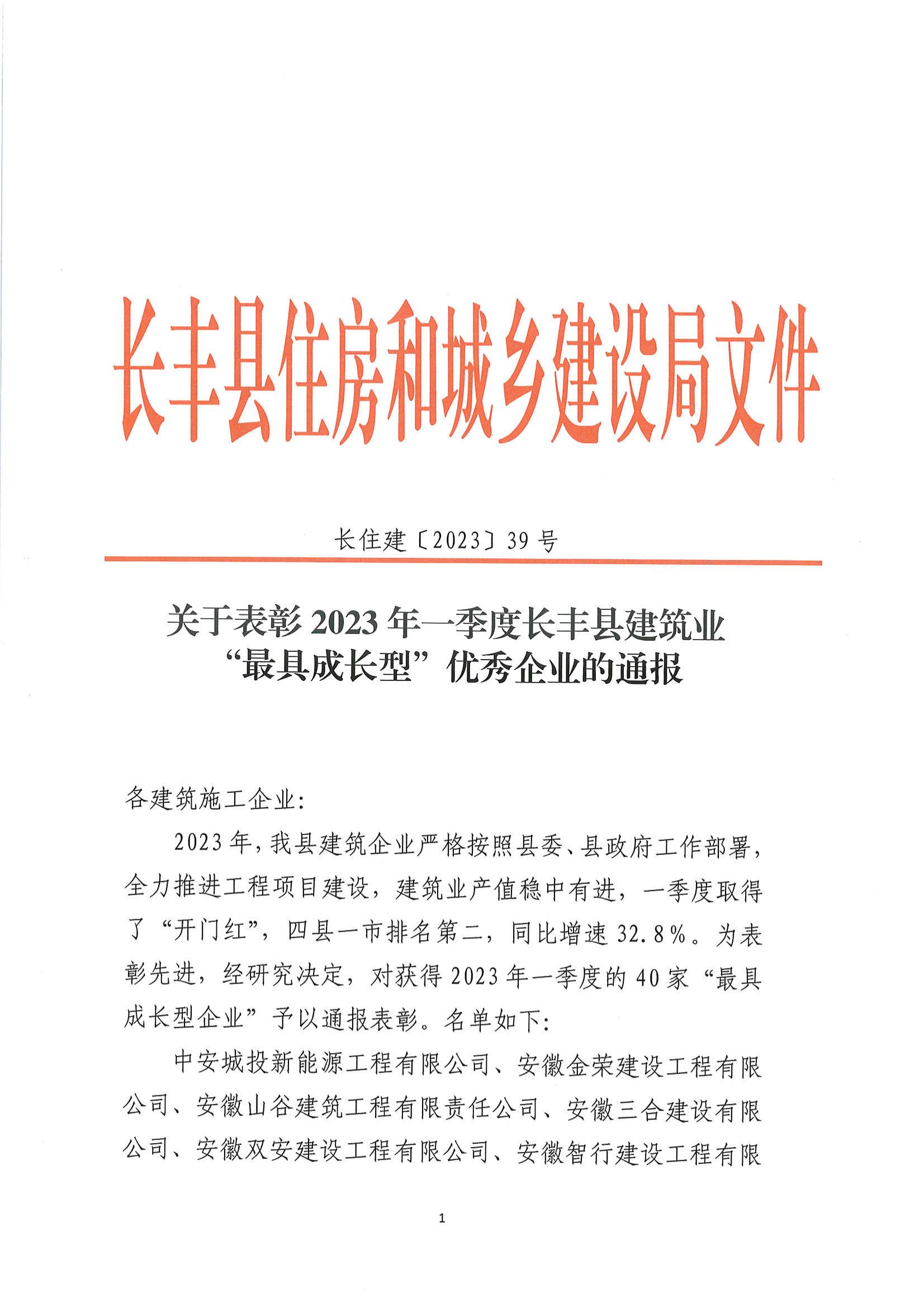 關于表彰2023年(nián)一(yī)季度長(cháng)豐縣建築業(yè)“最具成長(cháng)型”優秀企業(yè)的通(tōng)報(bào)